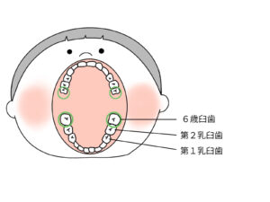 歯科医院でのフッ素塗布は、乳歯が生え始めた頃からおこなうことができます。なかでも、1歳半頃に最初の奥歯(第1乳臼歯)が生え始め、2歳半~3歳頃には第2乳臼歯が生えて乳歯が生え揃うため、フッ素塗布を始める一つの目安となる時期です。